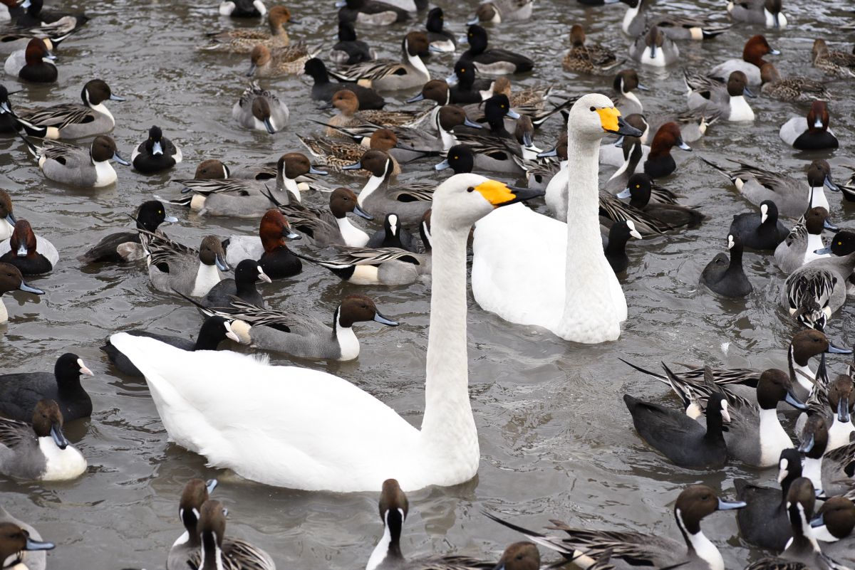 白鳥飛来スポットして有名ですが、驚愕するほどのカモが!実は昼間は、白鳥たちはエサを求めて田んぼへ行くそう。白鳥を見たいなら早朝か夕方が良さそうです。